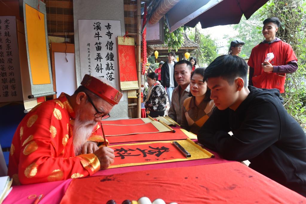 2月10日,在越南河內(nèi)的文廟-國子監(jiān),一名越南書法家為前來求字的一家三口書寫漢字“登科”。2月3日至2月19日,一年一度的新春書法節(jié)在越南首都河內(nèi)的文廟-國子監(jiān)舉辦。本次活動以“好學(xué)”為主題,邀請數(shù)十名越南書法家參與,其漢字書法作品集中展示區(qū)成為越南民眾的新晉打卡地。每逢農(nóng)歷春節(jié),許多越南民眾求取漢字書法作品為新年討個好彩頭。新華社記者胡佳麗 攝