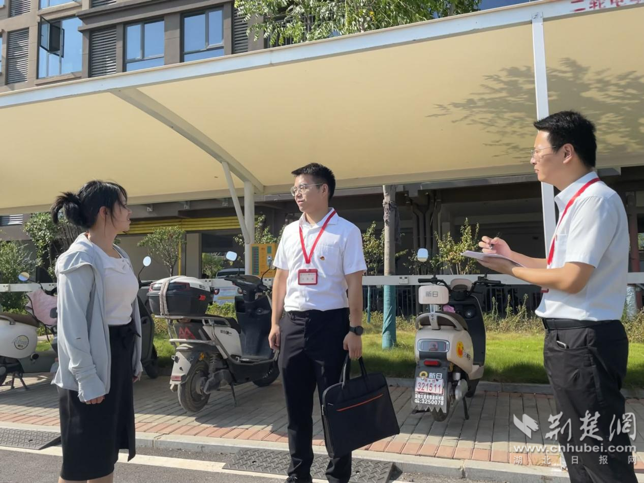 圖為該市紀(jì)檢監(jiān)察干部在雙河家園小區(qū)了解充電設(shè)施安裝情況。