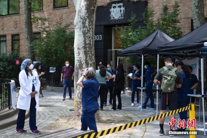 資料圖:當?shù)貢r間6月24日,美國紐約市政府在曼哈頓開設臨時診所,為易感人群接種猴痘疫苗。中新社記者 廖攀 攝