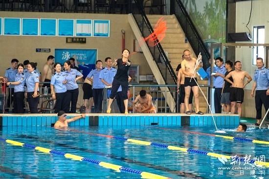 來(lái)到游泳館,市級(jí)教官、交管局車管所副所長(zhǎng)、二級(jí)警長(zhǎng)劉思杰現(xiàn)場(chǎng)培訓(xùn)救生桿、救生圈、救生繩、救生衣等救援器材規(guī)范操作,并下水操作展示涉水救援處置流程、救援器材使用等專業(yè)技能。