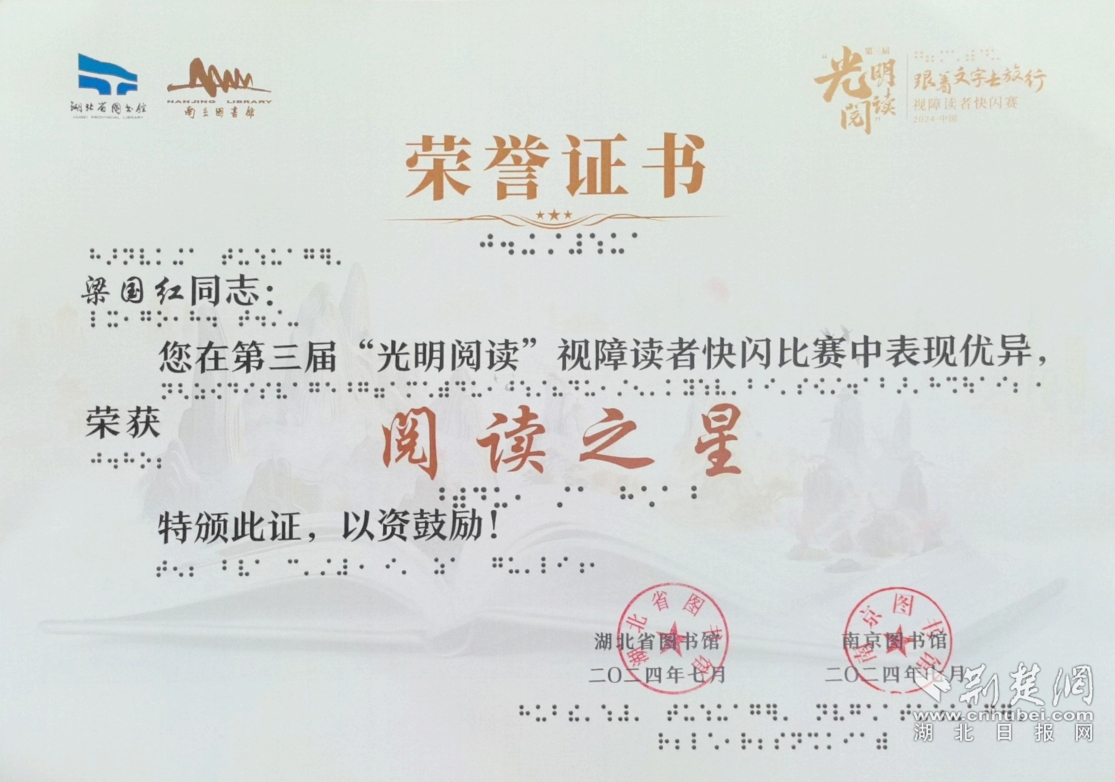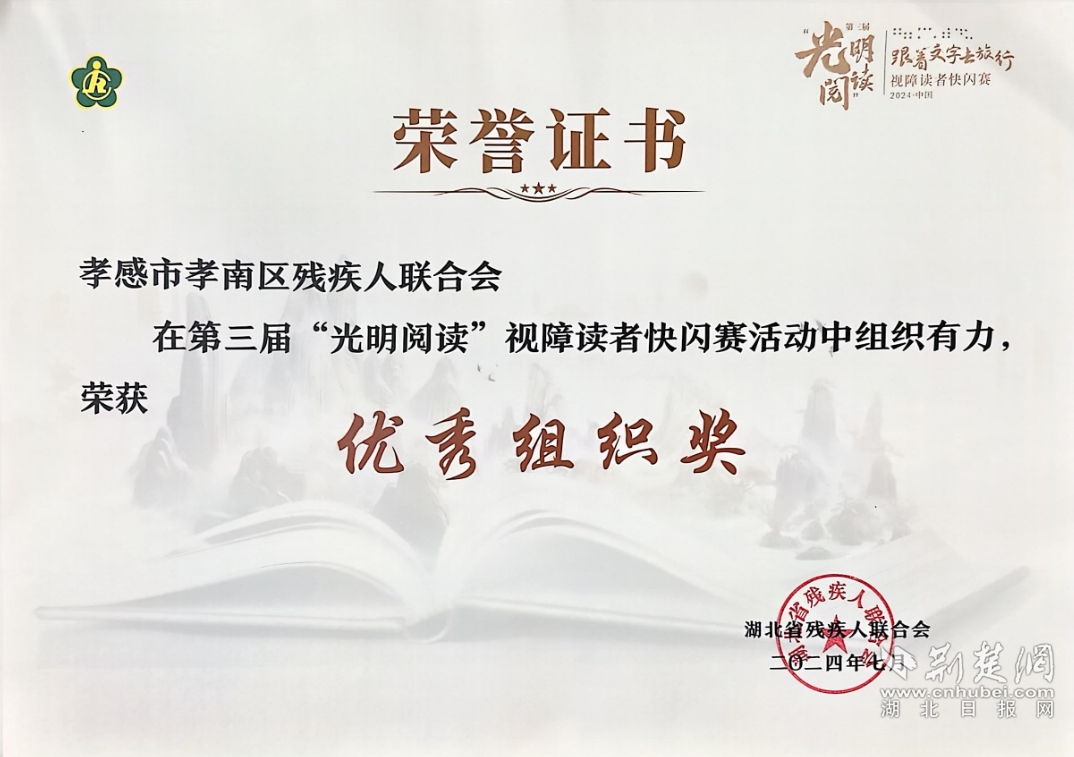 荊楚網(wǎng)(湖北日報網(wǎng))訊(通訊員 吳凌)近日,第三屆全國”光明閱讀"快閃賽組委會公布獲獎名單,孝南區(qū)殘聯(lián)榮獲“優(yōu)秀組織獎”榮譽(yù)稱號,孝南區(qū)視障讀者代表梁國紅被評為省級”閱讀之星”,8月22日下午,孝南區(qū)殘聯(lián)為梁國紅及時送了喜報。