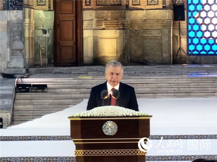 烏茲別克斯坦總統(tǒng)沙夫卡特·米爾濟(jì)約耶夫致辭。人民網(wǎng)記者 李強(qiáng)攝