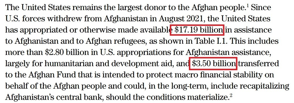 此前,美國國會(huì)設(shè)立的阿富汗重建特別檢查組在其季度報(bào)告中表示,自2021年8月以來,美國為阿富汗和阿富汗難民撥款約207億美元。其中,向阿富汗和阿富汗難民項(xiàng)目提供了171.9億美元的援助,以及將35億美元被凍結(jié)的阿富汗中央銀行資產(chǎn)轉(zhuǎn)移到“阿富汗人民基金”。