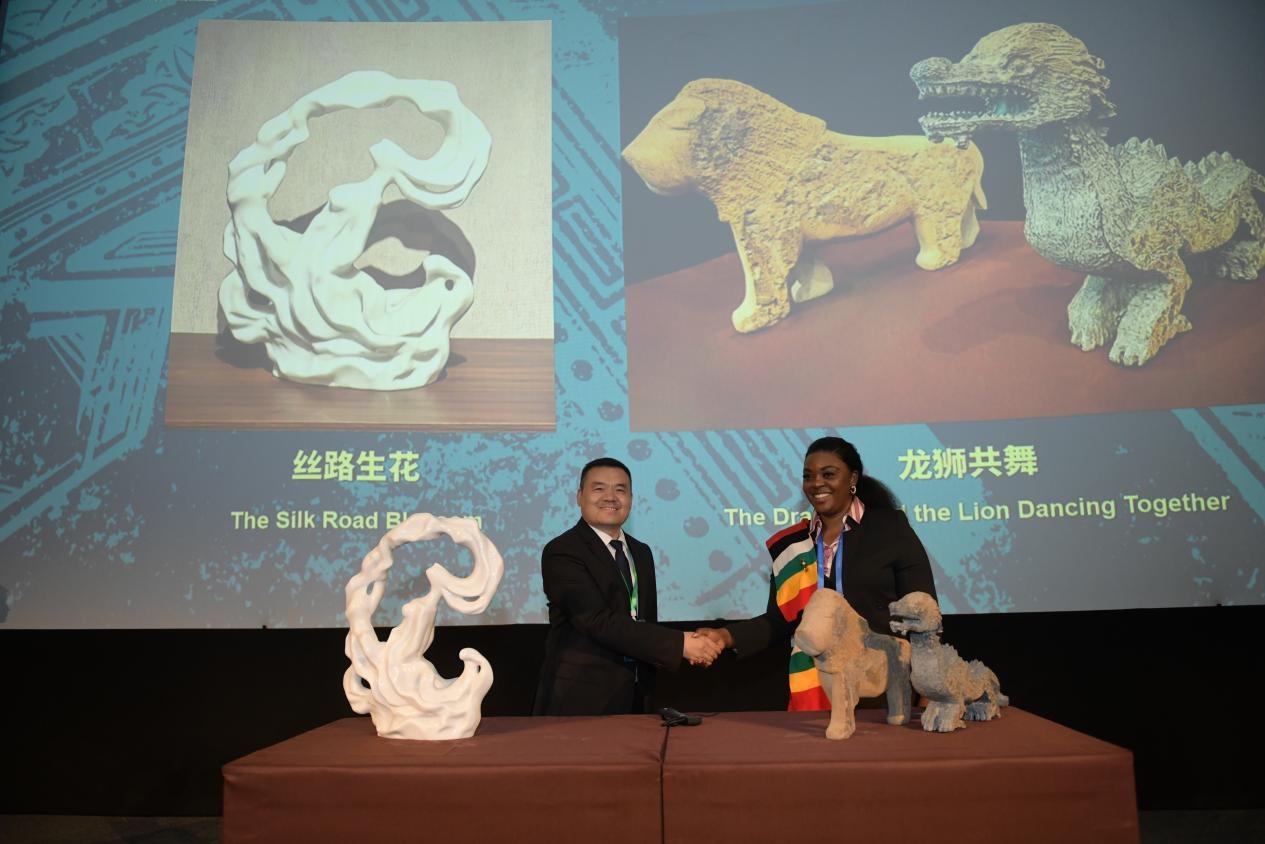 開幕式上發(fā)布了中津兩國合作攝制的紀(jì)錄片《石匠的跨時(shí)空對(duì)話》,來自津巴布韋和中國“雕刻之鄉(xiāng)”曲陽的兩位雕刻藝術(shù)家圍繞藝術(shù)造詣、傳承創(chuàng)新、文明互鑒展開對(duì)話交流。雙方還互贈(zèng)象征中津傳統(tǒng)友好的石雕藝術(shù)作品《絲路生花》和《龍獅共舞》。