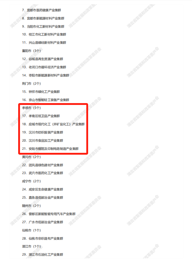 其中,孝南區(qū)紙衛(wèi)品產(chǎn)業(yè)集群、應(yīng)城市現(xiàn)代化工(井礦鹽化工)產(chǎn)業(yè)集群、漢川市紡織服裝產(chǎn)業(yè)集群、漢川市食品加工產(chǎn)業(yè)集群、安陸市銅箔及印制電路制造產(chǎn)業(yè)集群入選2024年湖北省縣域特色產(chǎn)業(yè)集群;孝南區(qū)華中國際食品商貿(mào)流通產(chǎn)業(yè)集群入選湖北省重點(diǎn)培育縣域特色產(chǎn)業(yè)集群名單。
