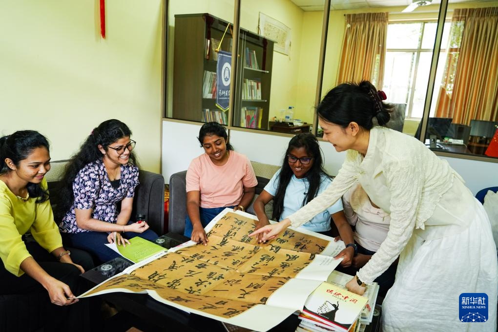 9月4日,在位于斯里蘭卡中央山脈南麓的薩伯勒格穆沃大學(xué),中國(guó)教師夏子涵(右)正在為孔子課堂漢語(yǔ)專(zhuān)業(yè)的學(xué)生們展示中國(guó)書(shū)法作品。新華社記者 陳冬書(shū) 攝