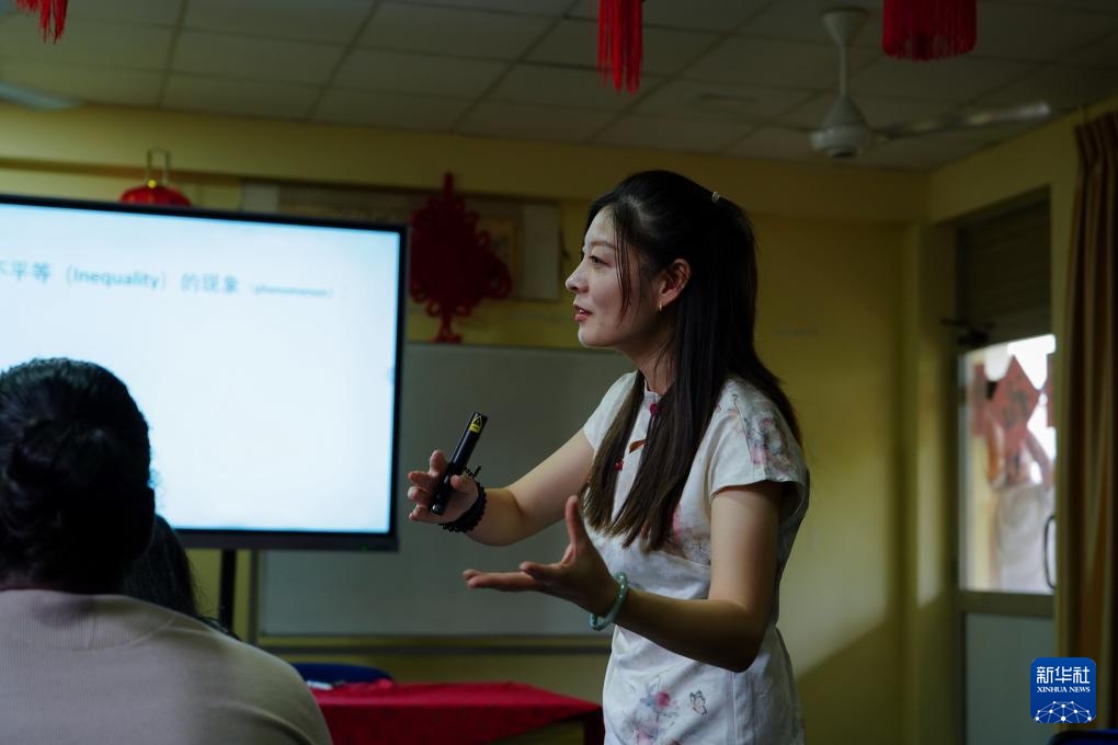 9月4日,在位于斯里蘭卡中央山脈南麓的薩伯勒格穆沃大學(xué),中國(guó)教師夏子涵正在為孔子課堂漢語(yǔ)專(zhuān)業(yè)的學(xué)生授課。新華社記者 伍岳 攝