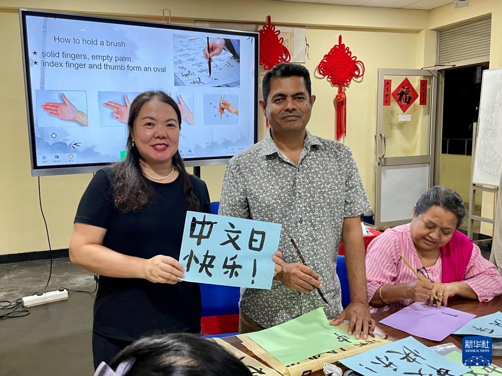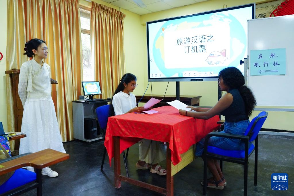 4月3日,在位于斯里蘭卡中央山脈南麓的薩伯勒格穆沃大學(xué),薩伯勒格穆沃大學(xué)孔子課堂院長(zhǎng)朱頌(左)在“國(guó)際中文日”活動(dòng)上與學(xué)校教職工漢語(yǔ)培訓(xùn)班的學(xué)員互動(dòng)。新華社發(fā)(薩伯勒格穆沃大學(xué)孔子課堂供圖)