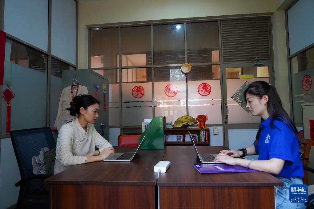 9月4日,在位于斯里蘭卡中央山脈南麓的薩伯勒格穆沃大學(xué),薩伯勒格穆沃大學(xué)孔子課堂的教師張歡(右)和夏子涵(左)在辦公室里備課。新華社記者 陳冬書(shū) 攝