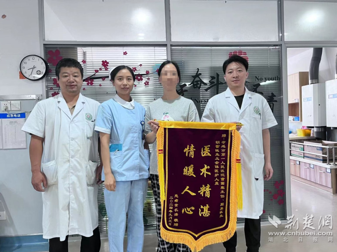 為了表達(dá)對(duì)醫(yī)護(hù)人員的感激之情,9月4日,在黃先生出院之際,他的妻子特地向醫(yī)院神經(jīng)外科贈(zèng)送了一面錦旗。