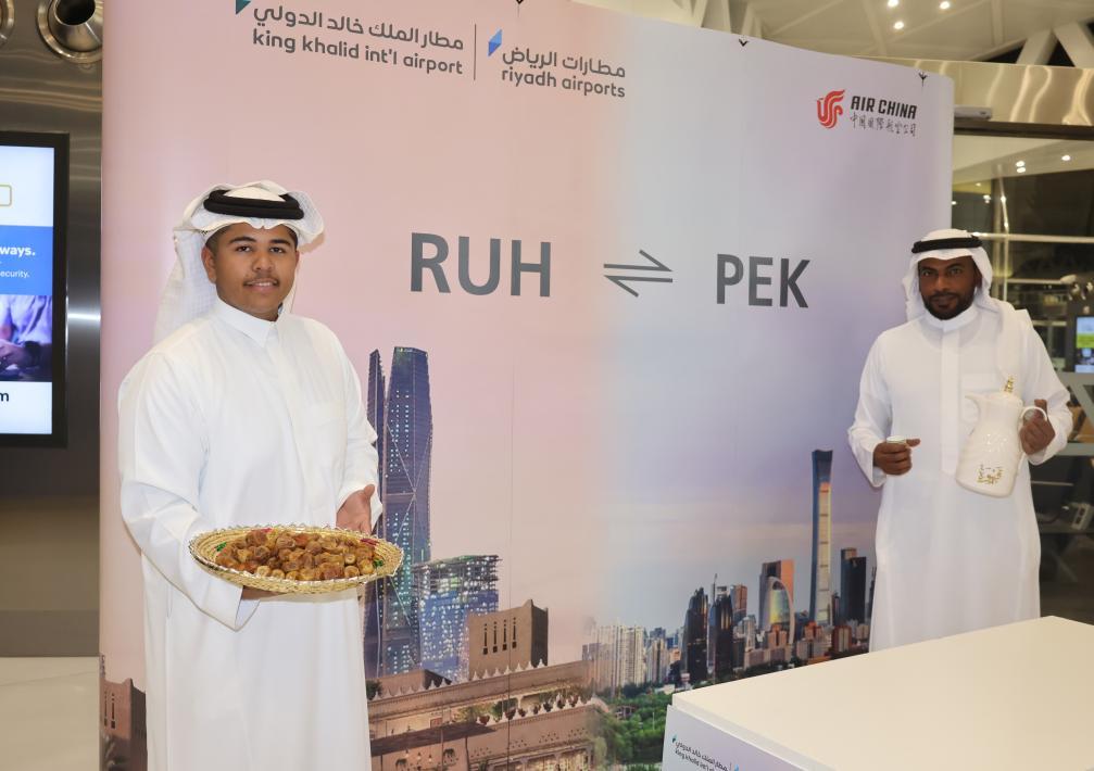 5月6日,工作人員在沙特阿拉伯利雅得哈立德國王機場迎接國航北京至利雅得直飛首航航班的旅客。新華社記者王海洲攝