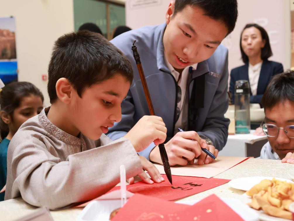 1月29日,在沙特阿拉伯首都利雅得的蘇爾坦親王大學,一名兒童在孔子學院展位體驗中國書法。新華社記者王海洲攝