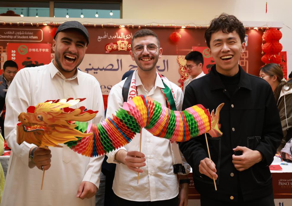 1月29日,沙特阿拉伯利雅得蘇爾坦親王大學學生在孔子學院展位與紙龍合影。新華社記者王海洲攝