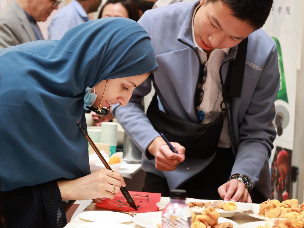 1月29日,沙特阿拉伯利雅得蘇爾坦親王大學學生在孔子學院展位體驗中國書法。新華社記者王海洲攝
