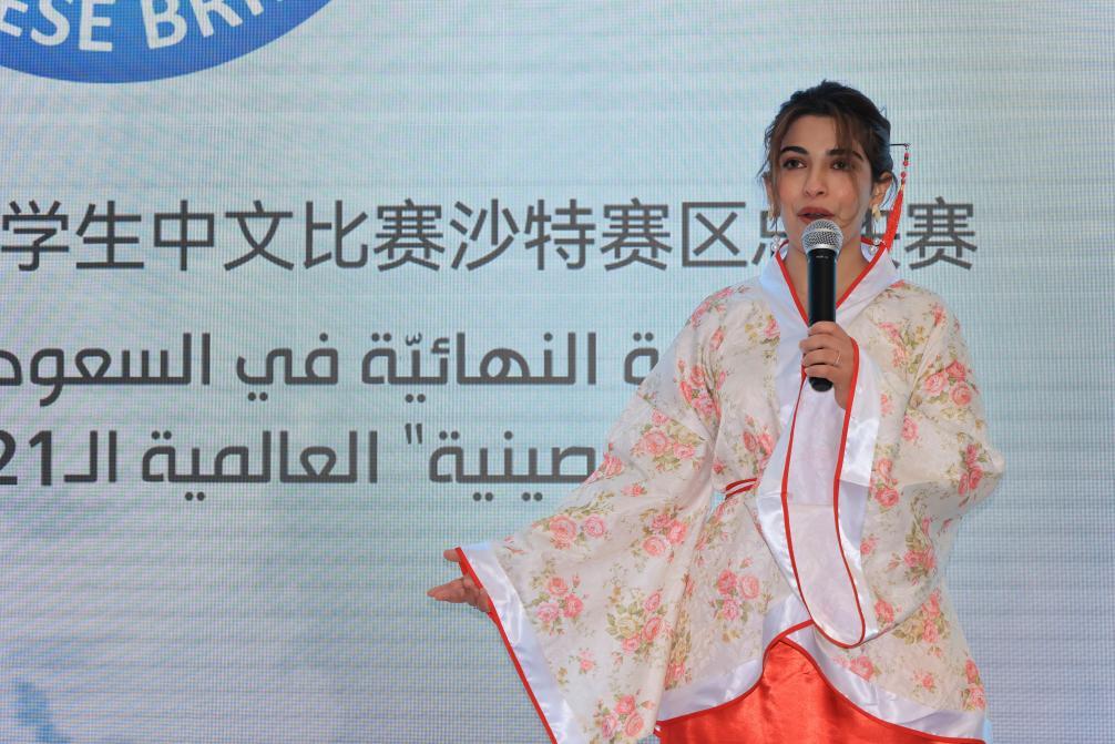 2022年7月20日,在沙特阿拉伯首都利雅得,參賽選手在“漢語橋”世界大學生中文比賽沙特賽區(qū)決賽中演講。新華社記者王海洲攝