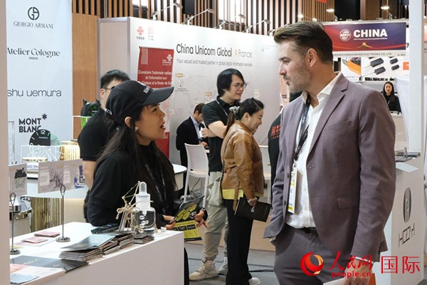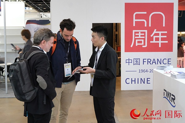 法國(guó)從業(yè)者在中國(guó)展區(qū)前咨詢。人民網(wǎng)記者 于超凡攝