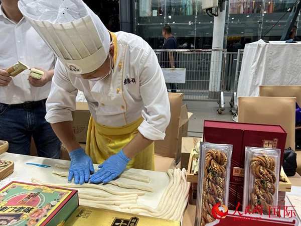 展臺(tái)面點(diǎn)師傅在活動(dòng)現(xiàn)場(chǎng)展示中國(guó)天津的桂發(fā)祥十八街麻花制作技藝。人民網(wǎng)記者 張矜若攝