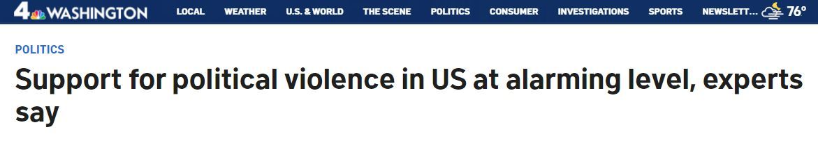 另外,美國國家廣播公司華盛頓地方頻道(NBC Washington)日前報道稱,盡管美國支持政治暴力的人與去年相比略有減少,但暴力支持者現在更傾向使用槍支來實現他們的目的。數月來,專家們始終表示,美國對出于政治動機的暴力的支持度達到了令人十分擔憂的水平。