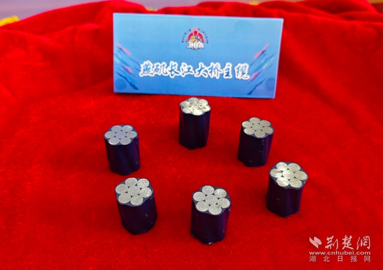 燕磯長(zhǎng)江大橋的項(xiàng)目書記、工會(huì)主席喻林峰介紹,這6根鋼索來自燕磯長(zhǎng)江大橋的主纜,它是2100兆帕的高強(qiáng)鋼索。燕磯長(zhǎng)江大橋是世界最大跨徑四主纜懸索橋,同時(shí)也是世界首座不同垂度四主纜雙層鋼桁梁懸索橋。大橋一共有四根主纜,每根主纜有217根索股,每根索股由127根如此次捐贈(zèng)的鋼索構(gòu)成。