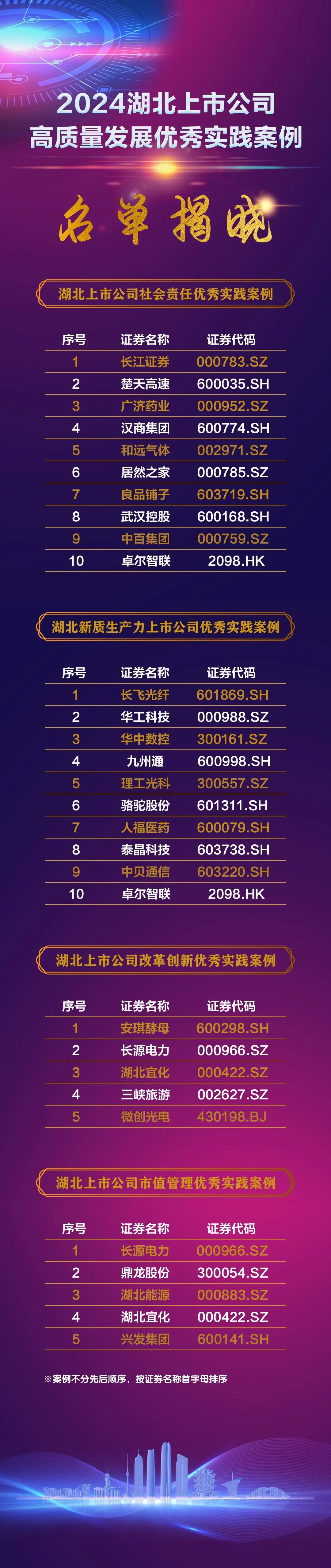 優(yōu)秀的企業(yè)總是自帶光芒。此次活動(dòng)現(xiàn)場(chǎng)還發(fā)布了《2024湖北上市公司高質(zhì)量發(fā)展優(yōu)秀實(shí)踐案例》,該案例由湖北日?qǐng)?bào)編輯部、支點(diǎn)財(cái)經(jīng)/支點(diǎn)雜志編輯部聯(lián)合湖北省社會(huì)科學(xué)院、華中科技大學(xué)經(jīng)濟(jì)學(xué)院、武漢大學(xué)經(jīng)濟(jì)與管理學(xué)院、楚商智庫(kù)等智力支持單位,通過(guò)深度調(diào)研走訪、案例征集、模型搭建、數(shù)據(jù)分析、問(wèn)卷調(diào)查等環(huán)節(jié),最終從社會(huì)責(zé)任、新質(zhì)生產(chǎn)力、改革創(chuàng)新、市值管理四個(gè)方面,共選取30個(gè)2023年表現(xiàn)優(yōu)秀的湖北上市公司案例,詳細(xì)解讀優(yōu)秀背后的成功密碼與經(jīng)驗(yàn)教訓(xùn),以期為更多企業(yè)提供參考借鑒。