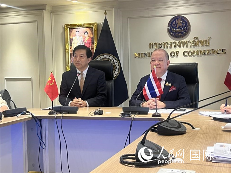 中國(guó)駐泰國(guó)大使韓志強(qiáng)和泰國(guó)商業(yè)部長(zhǎng)披差共同會(huì)見中泰兩國(guó)記者。人民網(wǎng)記者 張矜若攝