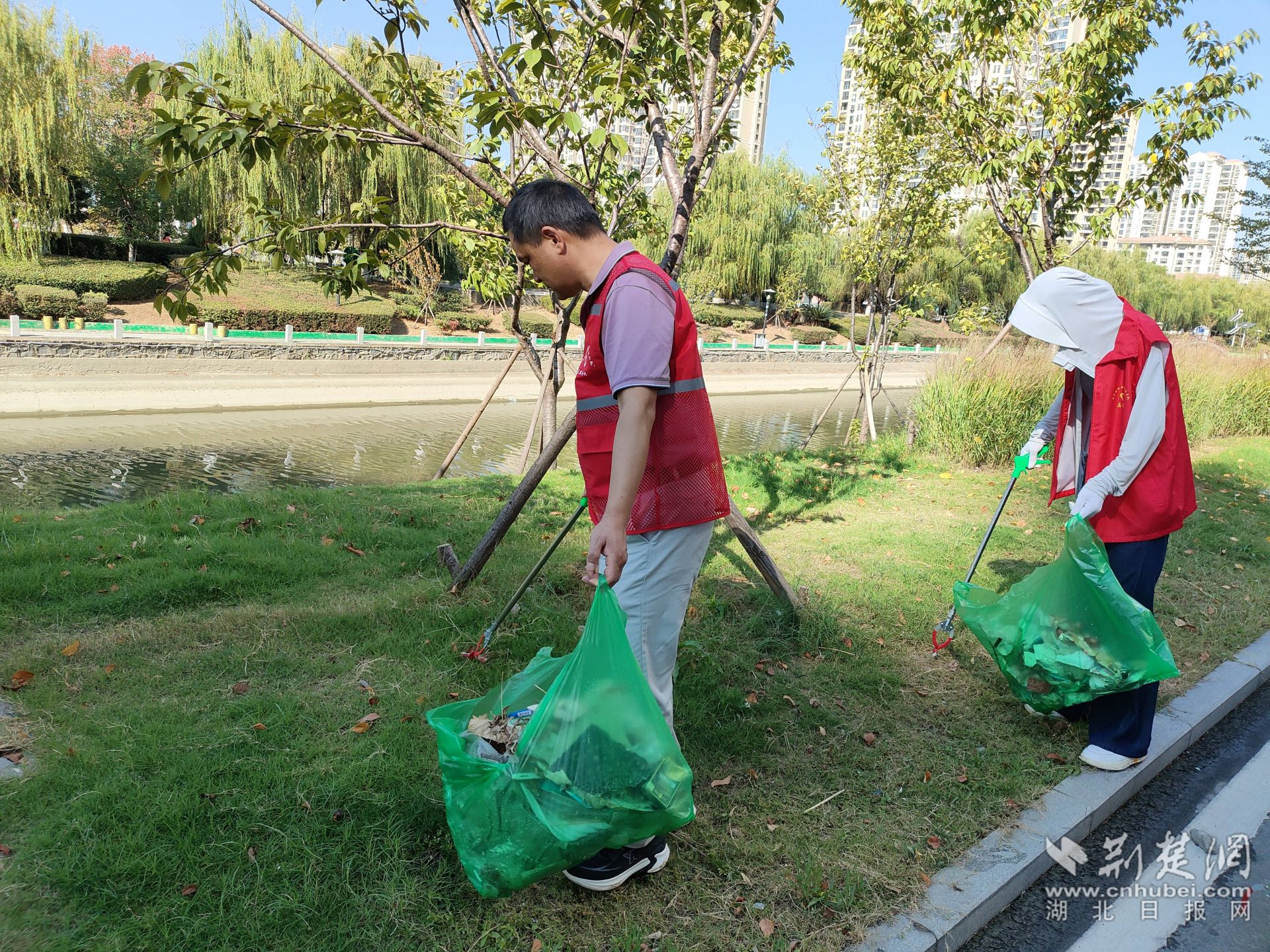 秋天的陽(yáng)光暖暖地照著大地,曲陽(yáng)河畔蕩漾著青春的氣息。志愿者身穿紅馬甲,沿著曲陽(yáng)河三湖橋段至都市云頂段,他們有的戴著手套撿拾地面的紙屑、煙頭,有的用鉗子夾取岸坡邊的盒子、飲料瓶,有的在打撈河面的漂浮物,有的將一袋袋裝好的垃圾投入垃圾桶里……