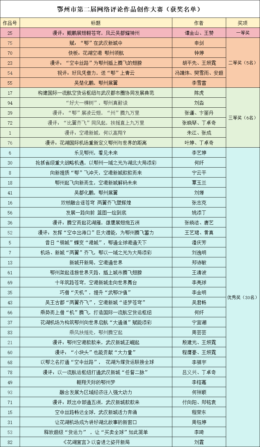 荊楚網(湖北日報網)訊(記者陶輝 通訊員陳穩(wěn)定)10月23日,鄂州市第二屆主題網評大賽獲獎名單出爐,42件作品分別獲得一、二、三等獎和優(yōu)秀獎。