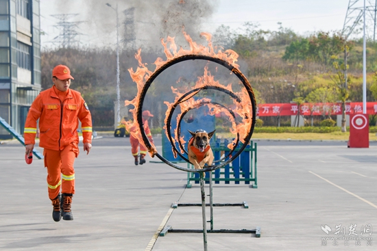 樓層綜合滅火演練前,現(xiàn)場先后開展了搜救犬綜合搜救操、繩索救援上升與下降操、綜合滅火救人操等科目。尤其是搜救犬互動表演,讓人驚嘆不已?!坝行覅⒓舆@次活動,還能‘擼’到搜救犬,近距離觀看到它們如何訓練、搜救,我很激動?!焙睅煼洞髮W文理學院消防志愿者王晨睿說。