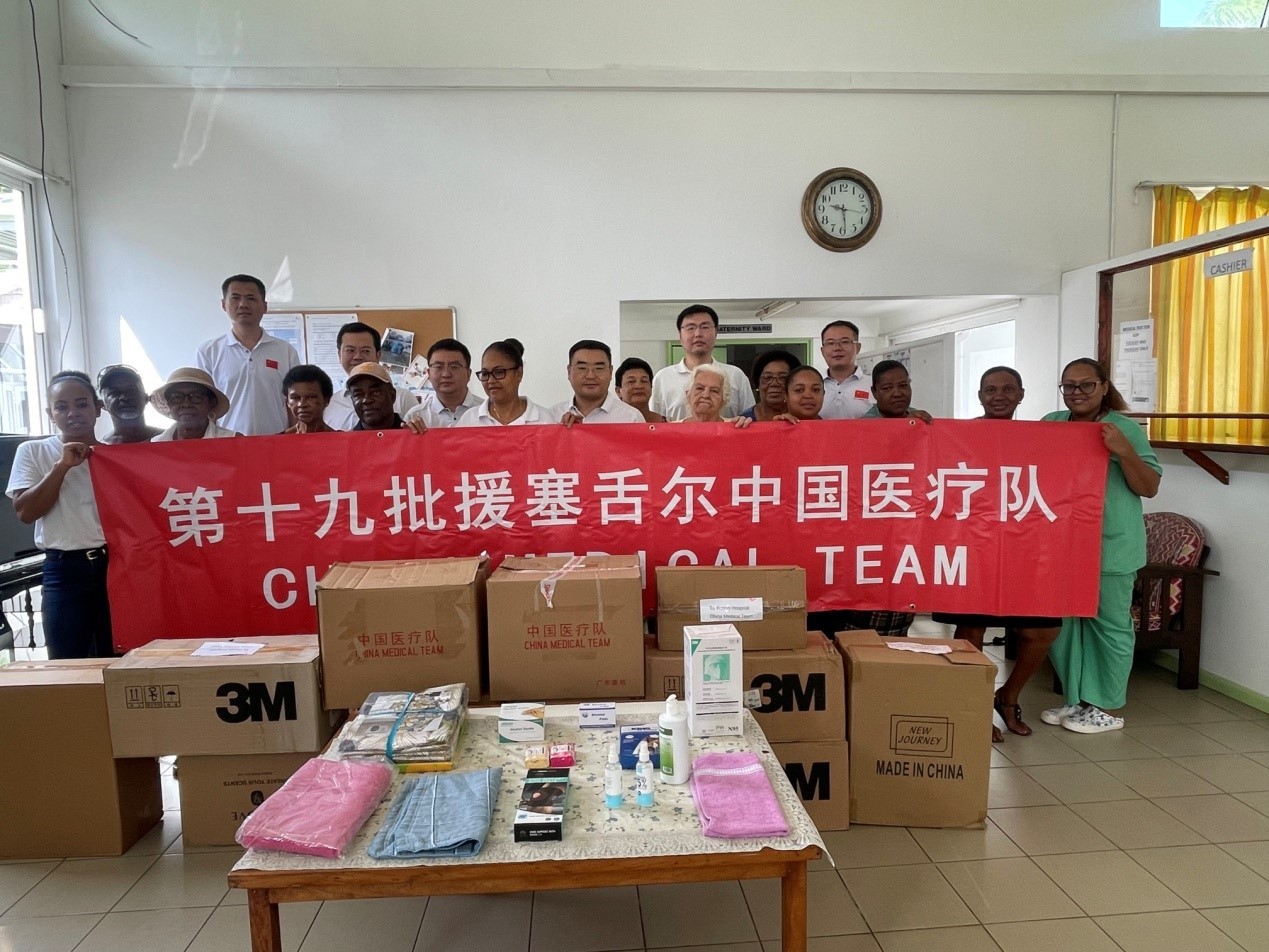 中國援塞舌爾醫(yī)療隊向普拉蘭島醫(yī)院捐贈物資。中國援塞舌爾醫(yī)療隊供圖