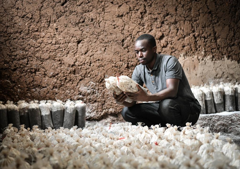 2024年8月14日,在盧旺達(dá)南方省穆漢加區(qū),尼揚(yáng)博·奧貝德在食用菌培育工坊內(nèi)檢查菌袋。曾兩次赴中國進(jìn)行菌草技術(shù)培訓(xùn)的尼揚(yáng)博·奧貝德在南方省和東方省各擁有一家工坊。(新華社記者韓旭攝)