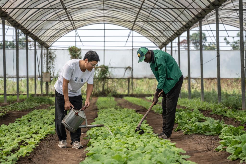 2024年8月3日,在剛果(布)首都布拉柴維爾的中國援剛果(布)農(nóng)業(yè)技術(shù)示范中心內(nèi),中方農(nóng)業(yè)專家李科明(左)與當(dāng)?shù)貑T工在大棚內(nèi)耕作。(新華社記者鄭揚(yáng)子攝)