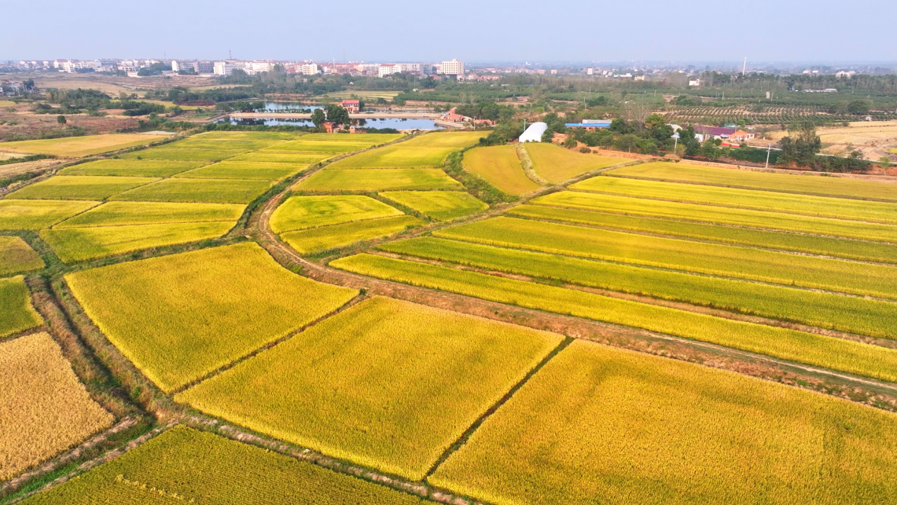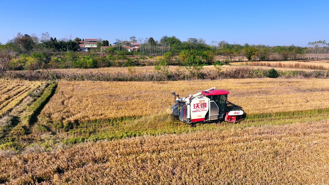 從高空俯瞰,孝昌縣鄒崗鎮(zhèn)的萬畝稻田與鄉(xiāng)村農(nóng)舍、藍(lán)天白云相互映襯,構(gòu)成一幅金光燦爛的美麗鄉(xiāng)村田園畫卷。連片水稻田隨風(fēng)搖曳,收割機(jī)在稻田來回穿梭,機(jī)身隆隆,一串串飽滿的稻穗卷入齒輪,收割、脫粒、吐桿、裝車,機(jī)械化收割一氣呵成,高效有序。