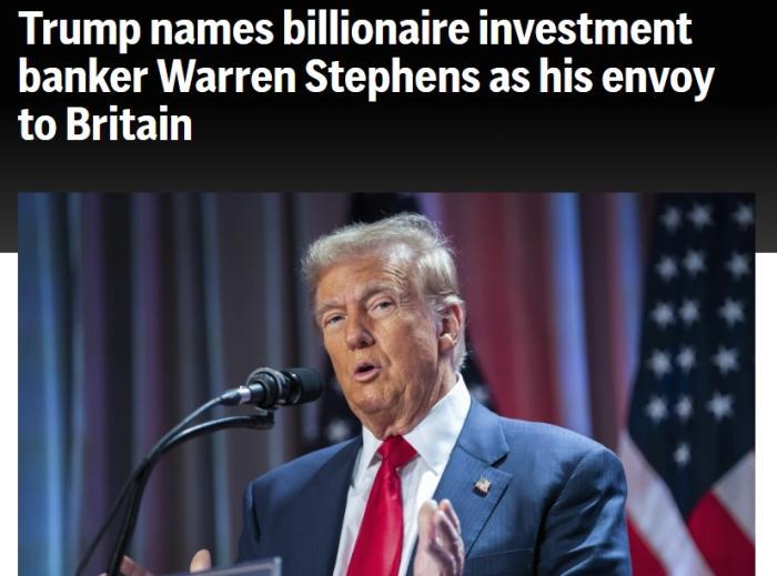中新網(wǎng)12月3日電 據(jù)美聯(lián)社報道,當(dāng)?shù)貢r間2日,美國當(dāng)選總統(tǒng)特朗普宣布提名投資銀行家沃倫·斯蒂芬斯(Warren Stephens)擔(dān)任美國駐英國大使。
