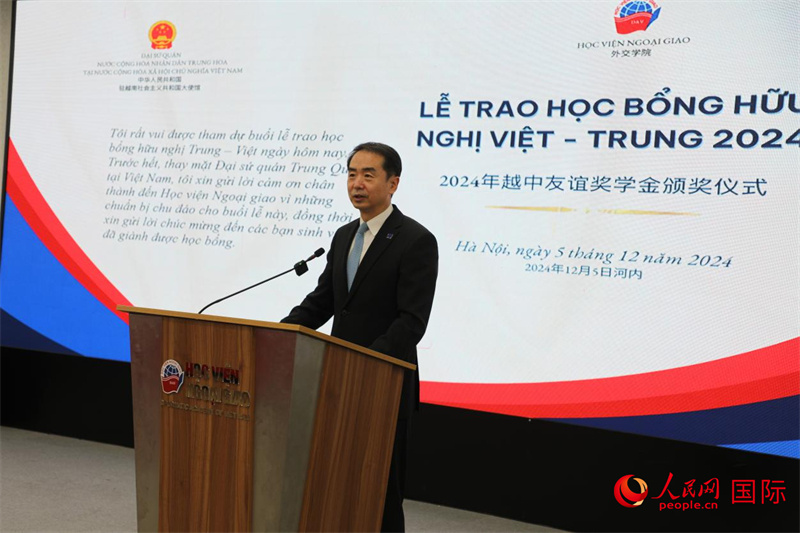 人民網(wǎng)河內(nèi)12月6日電 (記者楊曄)12月5日,中國(guó)駐越南大使何煒赴越南外交學(xué)院出席“中越友好獎(jiǎng)學(xué)金”頒發(fā)儀式。越南外交學(xué)院代院長(zhǎng)阮雄山偕師生代表近100人出席。