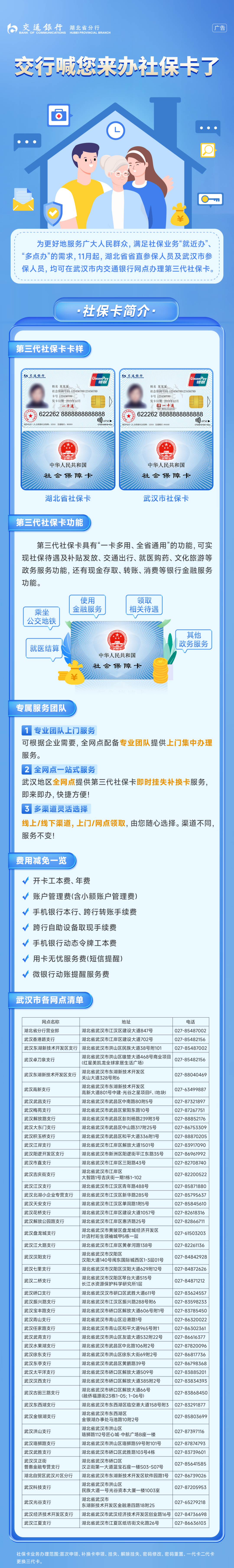 為更好滿足省直參保服務(wù)對象社??I(yè)務(wù)“就近辦”“多點辦”的需求,解決武漢地區(qū)省直社??ǚ?wù)網(wǎng)點少、覆蓋面不全等問題,省人社廳信息中心聯(lián)合工商銀行、農(nóng)業(yè)銀行、漢口銀行等6家合作銀行開展社保卡服務(wù)網(wǎng)點擴面行動,全市新增107個銀行網(wǎng)點可辦理省直社保卡業(yè)務(wù)。在武漢居住的省直社保卡持卡人可就近選擇任一網(wǎng)點辦理第三代社??ㄉ觐I(lǐng)、補換等社??I(yè)務(wù),支持即時制卡“立等可取”。同時,部分銀行還推出了社??▽m梼?yōu)惠活動,讓持卡人通過社??ㄇ袑嵪硎艿奖忝窕菝穹?wù)。