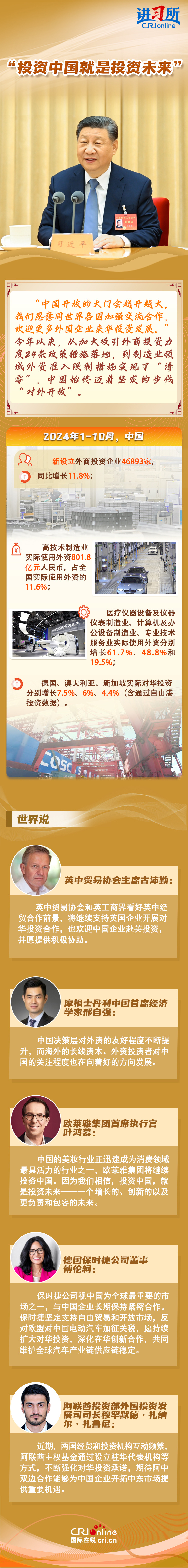 “中國是實干家、行動派。”今年以來,從習近平主席的歐洲之行到拉美之行,再到四天前在北京會見主要國際經(jīng)濟組織負責人,習近平一直強調(diào),中國的發(fā)展將給世界帶來巨大機遇。據(jù)聯(lián)合國貿(mào)易和發(fā)展會議不久前發(fā)布的《世界投資報告2024》中文版顯示,中國吸引外資的結(jié)構(gòu)不斷優(yōu)化、質(zhì)量不斷提高,多位政商界人士也認為中國是一個非常有前景的市場,投資中國就是投資未來。