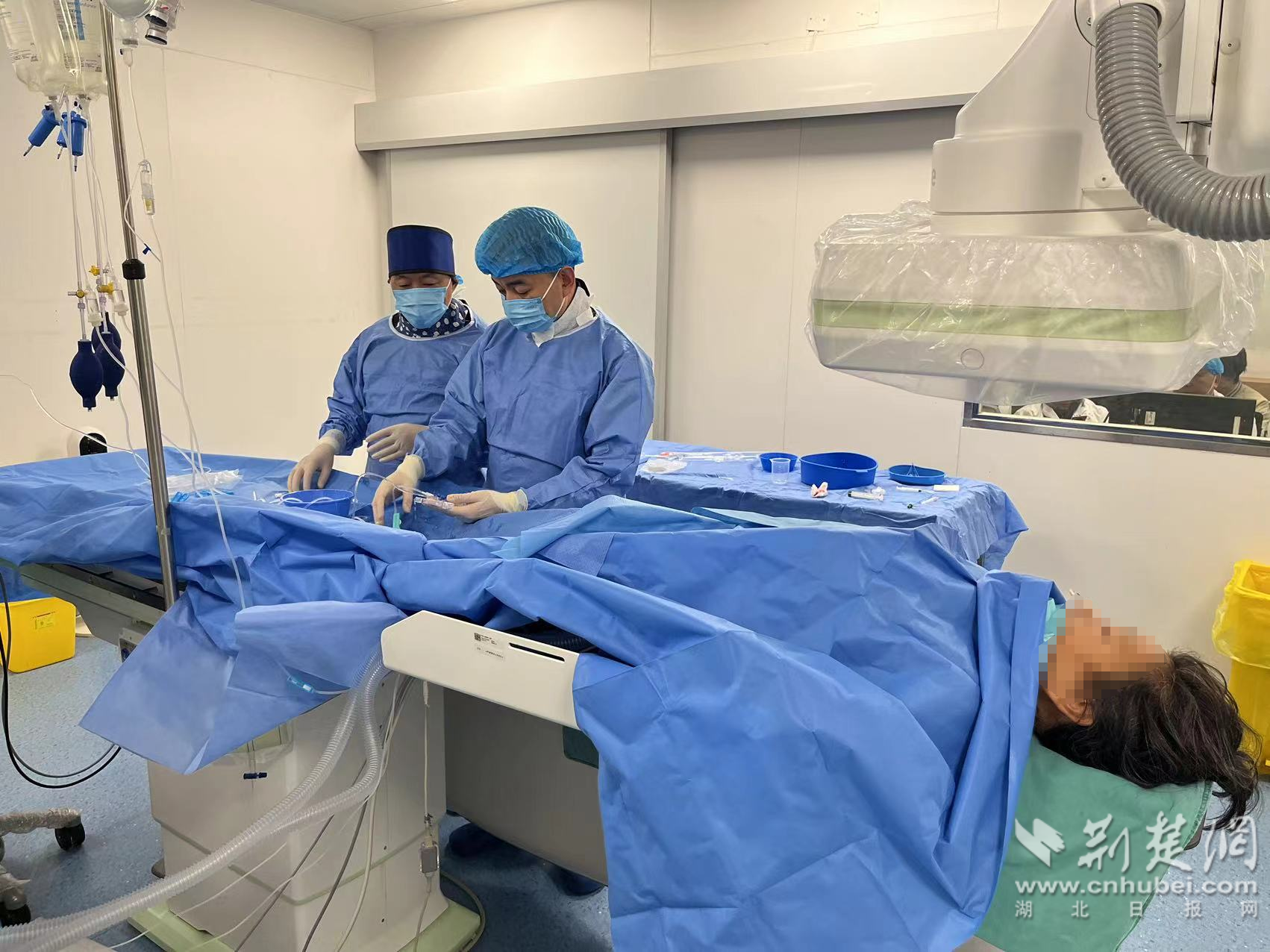 12月11日,66歲的徐女士在家中突發(fā)頭痛、頭昏、乏力,右側(cè)肢體無(wú)力,并伴有多次惡心嘔吐,暈倒在地后,被家人撥打120緊急送入孝感市中醫(yī)醫(yī)院。檢查顯示蛛網(wǎng)膜下腔出血,急診以大腦中動(dòng)脈瘤破裂伴蛛網(wǎng)膜下腔出血收入外一科住院?;颊唠S時(shí)可能病情惡化,導(dǎo)致腦疝、遲發(fā)性腦出血、癲癇、急性心肌梗死、肺栓塞、應(yīng)激性潰瘍急性腦梗塞、惡性心律失常、多器官功能不全甚至心臟驟停等危險(xiǎn)。ICU主任沈傳運(yùn)和神經(jīng)外科主任顏學(xué)槐會(huì)診后,徐女士被轉(zhuǎn)入ICU進(jìn)行重癥監(jiān)護(hù)支持治療。與此同時(shí),孝感市中醫(yī)醫(yī)院通過(guò)醫(yī)聯(lián)體,邀請(qǐng)武漢市第一醫(yī)院羅明教授星夜馳援。