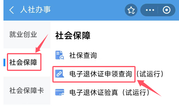 第三步:在【社會保障】欄目中選擇“電子退休證申領(lǐng)查詢”(圖⑤)。