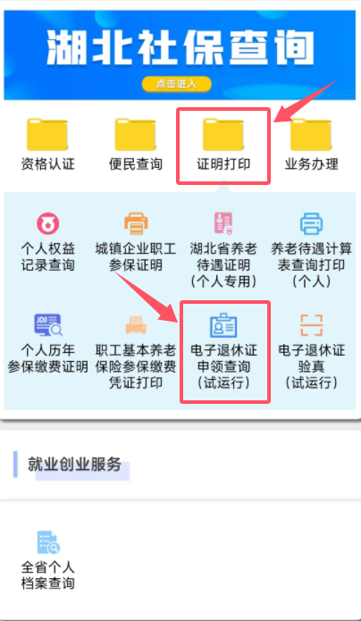第二步:進入“湖北智慧人社服務大廳”后,下劃至“湖北社保查詢”,在該欄目下的【證明打印】中選擇“電子退休證申領(lǐng)查詢”,點擊進入(圖②)。
