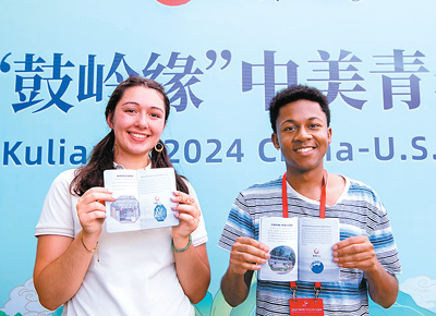參加2024“鼓嶺緣”中美青年交流周活動的兩名學(xué)生代表展示在鼓嶺“打卡”“蓋章”。