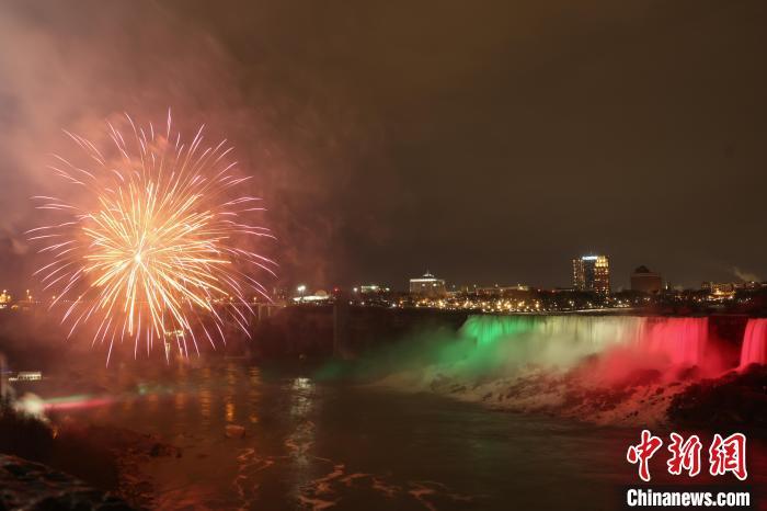 當(dāng)?shù)貢r(shí)間2024年12月31日晚,加拿大知名觀光勝地尼亞加拉大瀑布燃放煙花,迎接2025年的到來?!≈行律缬浾?余瑞冬 攝