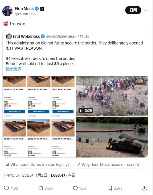 這位用戶總結(jié)道:“這屆政府并沒(méi)有確保邊境安全,他們是故意開(kāi)放邊境的,這是叛國(guó)行為?!?/p>