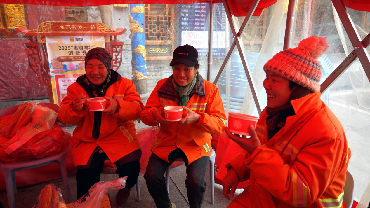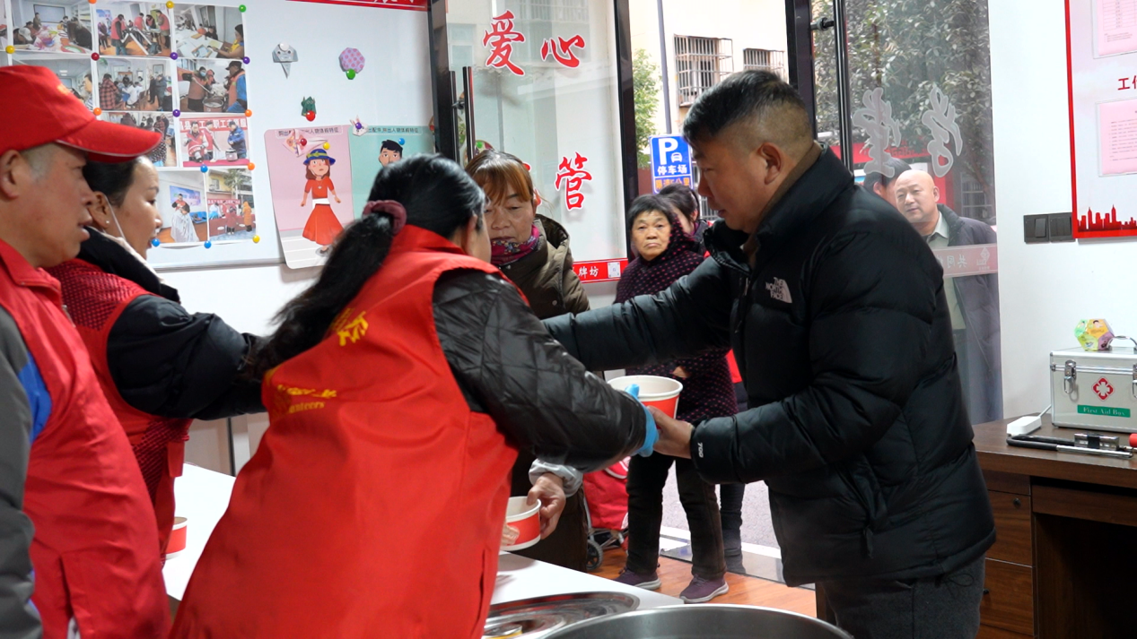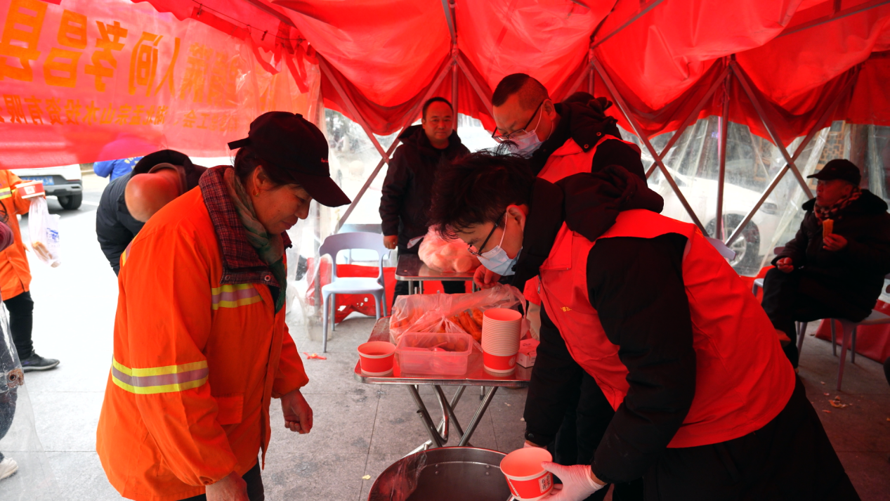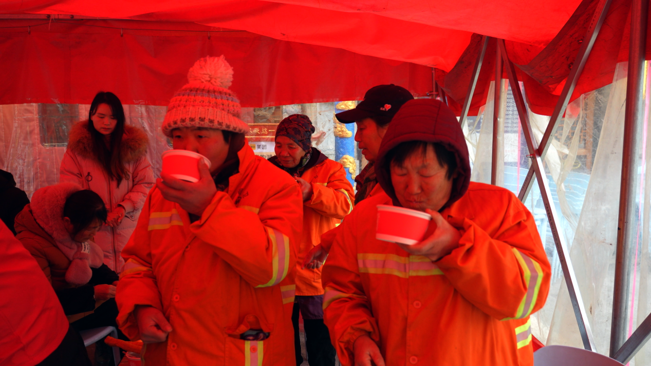 “我們?cè)缟掀饋?lái)很冷的,今天是臘八節(jié),政府送溫暖,給我們喝粥,喝得心里暖暖的,還有包子、油條、雞蛋,對(duì)我們環(huán)衛(wèi)工人很貼心、很溫暖?!杯h(huán)衛(wèi)工人江秋珍說(shuō)。