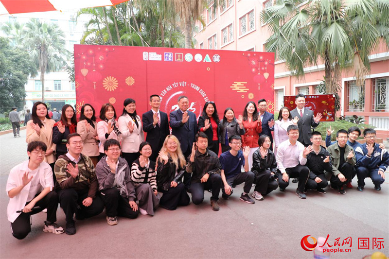 鄭大偉教育參贊和阮氏菊芳副校長與中越兩國師生代表合影。人民網(wǎng)記者 楊曄攝