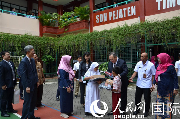 劉建超向印尼小學(xué)生贈(zèng)送禮品。人民網(wǎng)記者 李培松攝