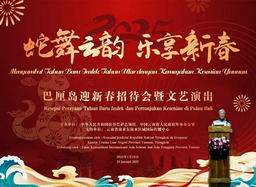 人民網(wǎng)雅加達1月22日電(記者李培松)1月19日,中國駐登巴薩總領(lǐng)館在印度尼西亞巴厘島舉辦2025年春節(jié)招待會暨云南省歌舞團慶新春專場演出。中國駐登巴薩總領(lǐng)事張志昇和巴厘省代理省長代表、省文化局局長蘇吉爾達出席并致辭。領(lǐng)區(qū)政府官員、各界代表以及當?shù)刂匈Y機構(gòu)、華僑華人等近700人出席。
