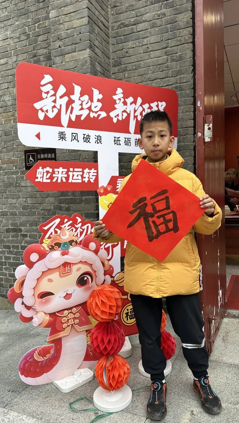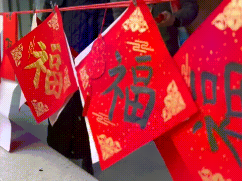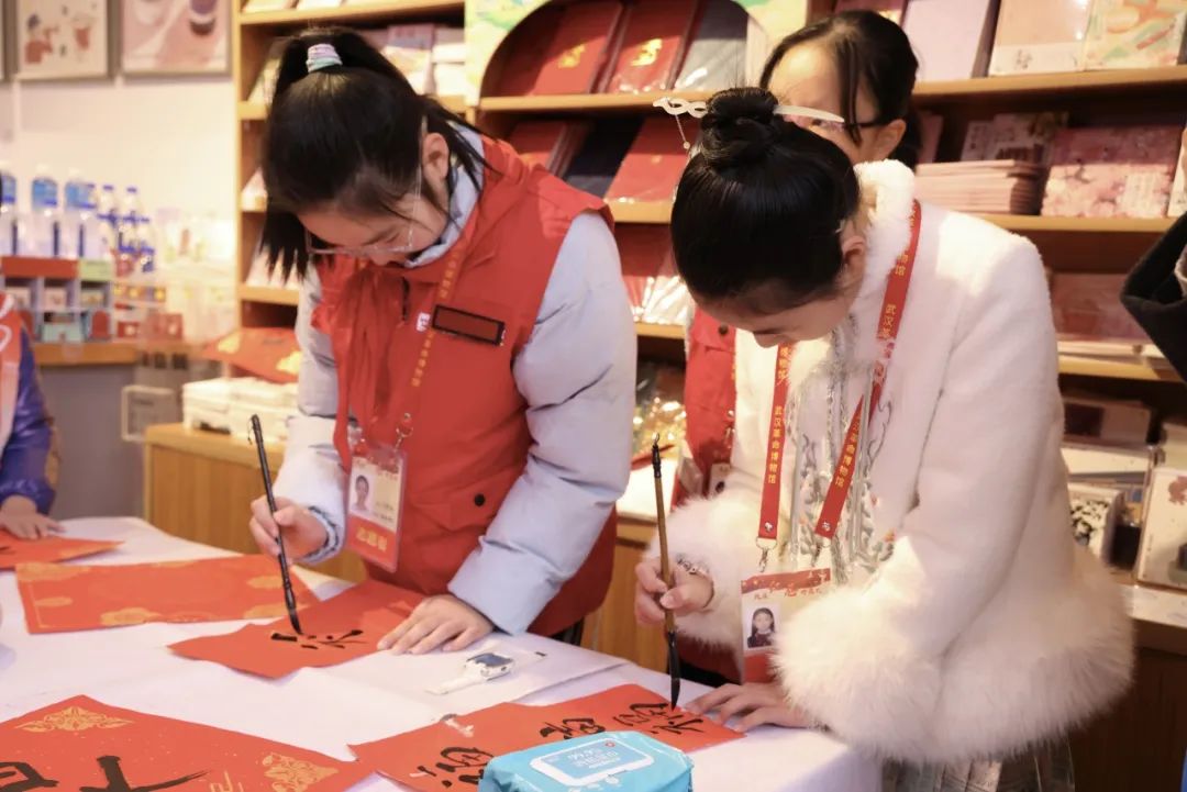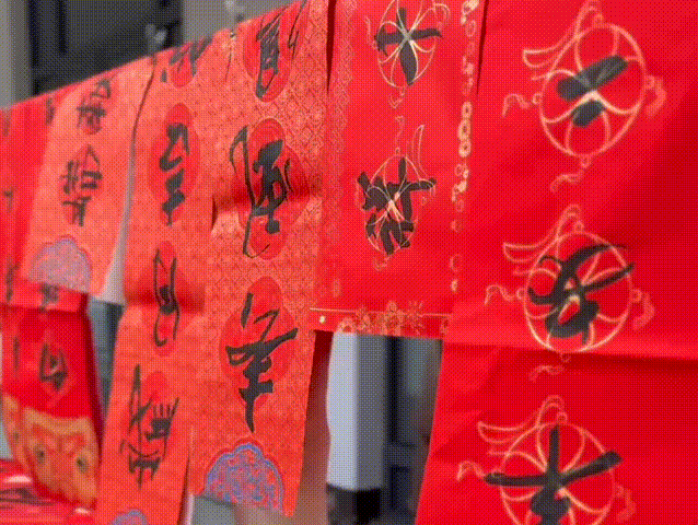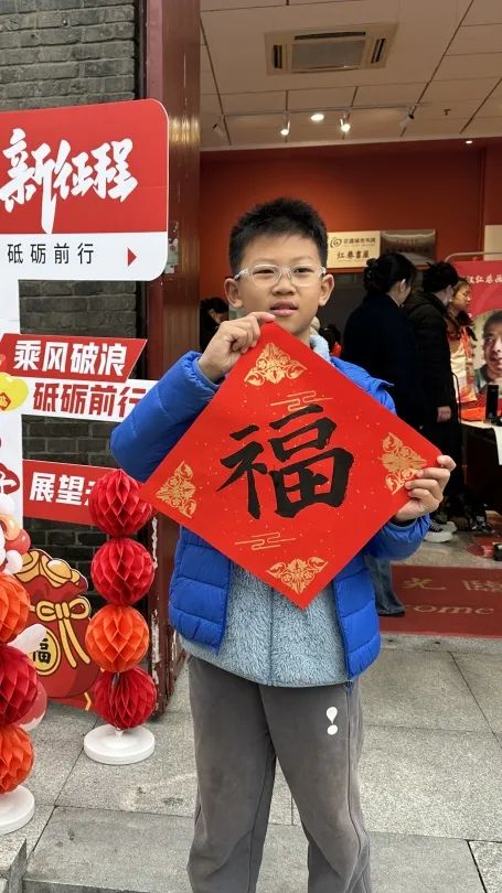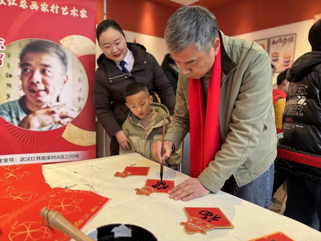 紅巷畫(huà)家村藝術(shù)家徐智、肖中華、張永偉三位老師攜手“紅巷苗苗”余錦希 、付珞桐、謝佳琪、江昱萱、王千溢等,凝神聚氣、揮毫潑墨,一副副寓意祥瑞的春聯(lián),一張張飽含祝福的福字,透著墨香,承載著吉祥,化作最真摯的祝福送到觀眾手上。