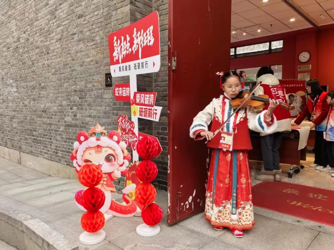 貼春聯(lián)、寫(xiě)福字是小年的傳統(tǒng)習(xí)俗。伴隨著“紅巷苗苗”余昕遠(yuǎn)帶來(lái)的悠揚(yáng)的小提琴曲目《新春樂(lè)》,“老少同書(shū)祝福聯(lián)”拉開(kāi)序幕。