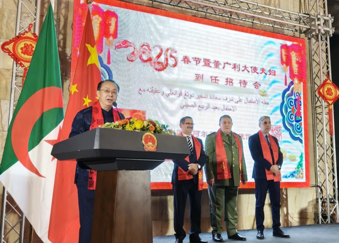 人民網(wǎng)阿爾及爾1月24日電 (記者郝瑞敏)1月23日,中國(guó)駐阿爾及利亞大使館舉辦2025年春節(jié)暨董廣利大使夫婦到任招待會(huì)。阿民族院議長(zhǎng)代表、外委會(huì)主席,人民軍總參謀長(zhǎng)代表、國(guó)防部對(duì)外關(guān)系與合作局局長(zhǎng),海關(guān)總局局長(zhǎng),以及政府、議會(huì)、政黨、媒體、智庫(kù)等各界人士,各國(guó)使節(jié),中資機(jī)構(gòu)和華僑華人代表等約650人出席。