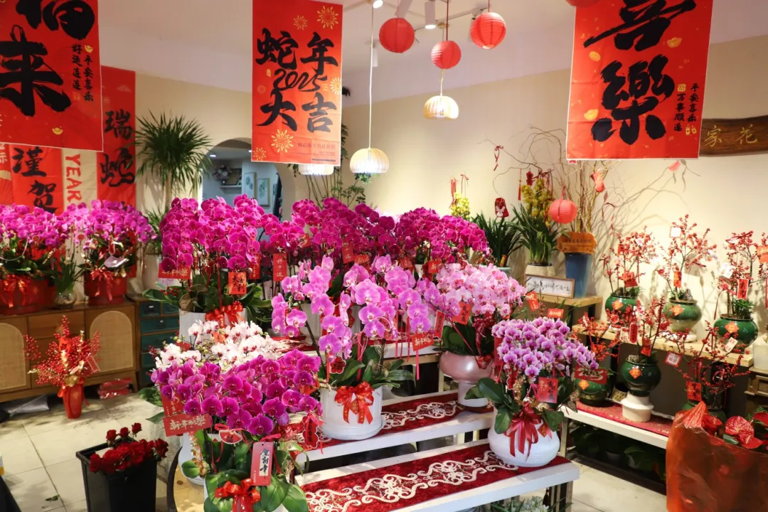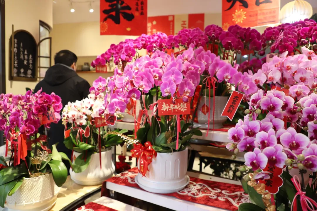 走進(jìn)老孝感巷尾的一家花店,一排排姹紫嫣紅的蝴蝶蘭占據(jù)著小店“C位”,周圍掛著的新年橫幅把小店裝扮得格外喜慶。